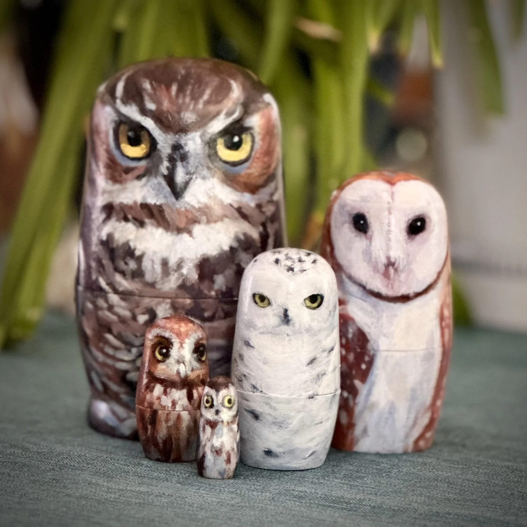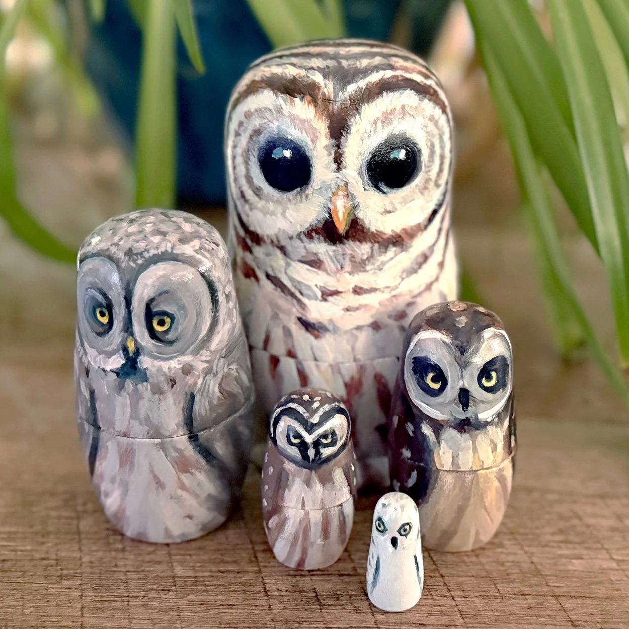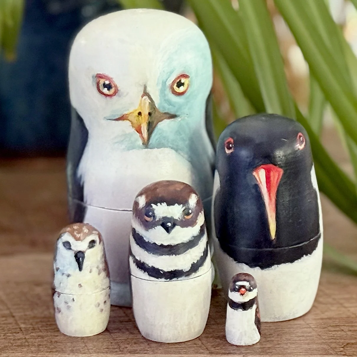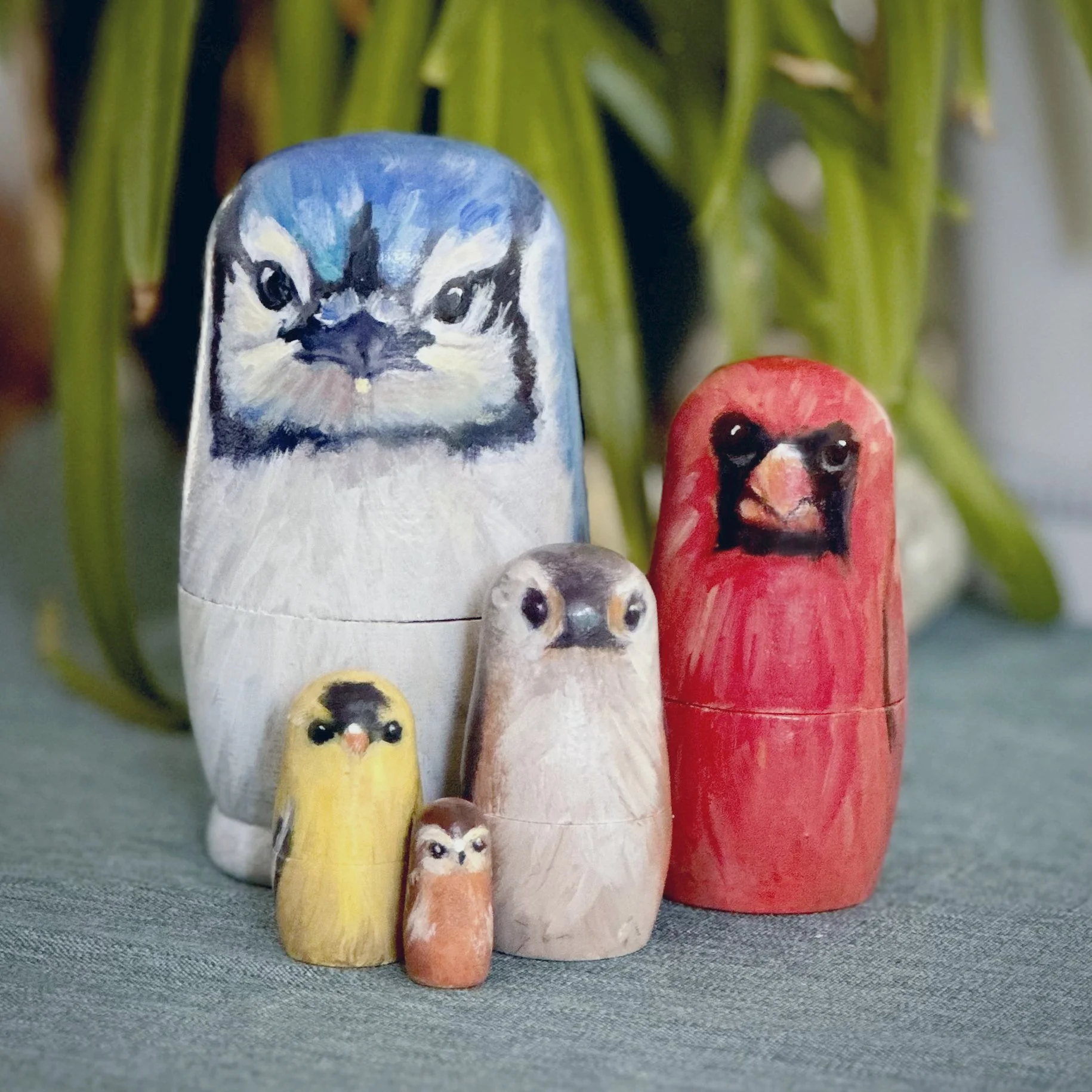 A new take on a traditional collectible item, these whimsical matryoshka nesting dolls are hand-painted with vibrant, one-of-a-kind bird designs - each set featuring a grouping of 5 similar birds. From tiniest to largest, they’re a fun twist on the classic Russian doll tradition. Perfect for collectors and bird lovers alike.