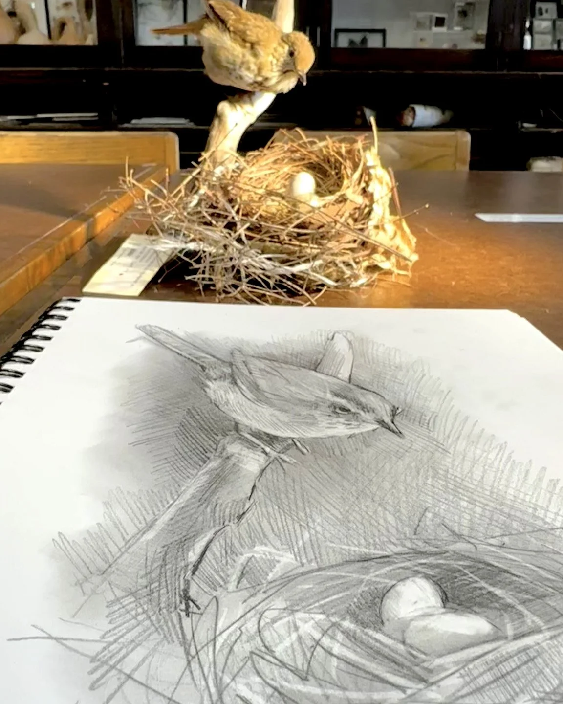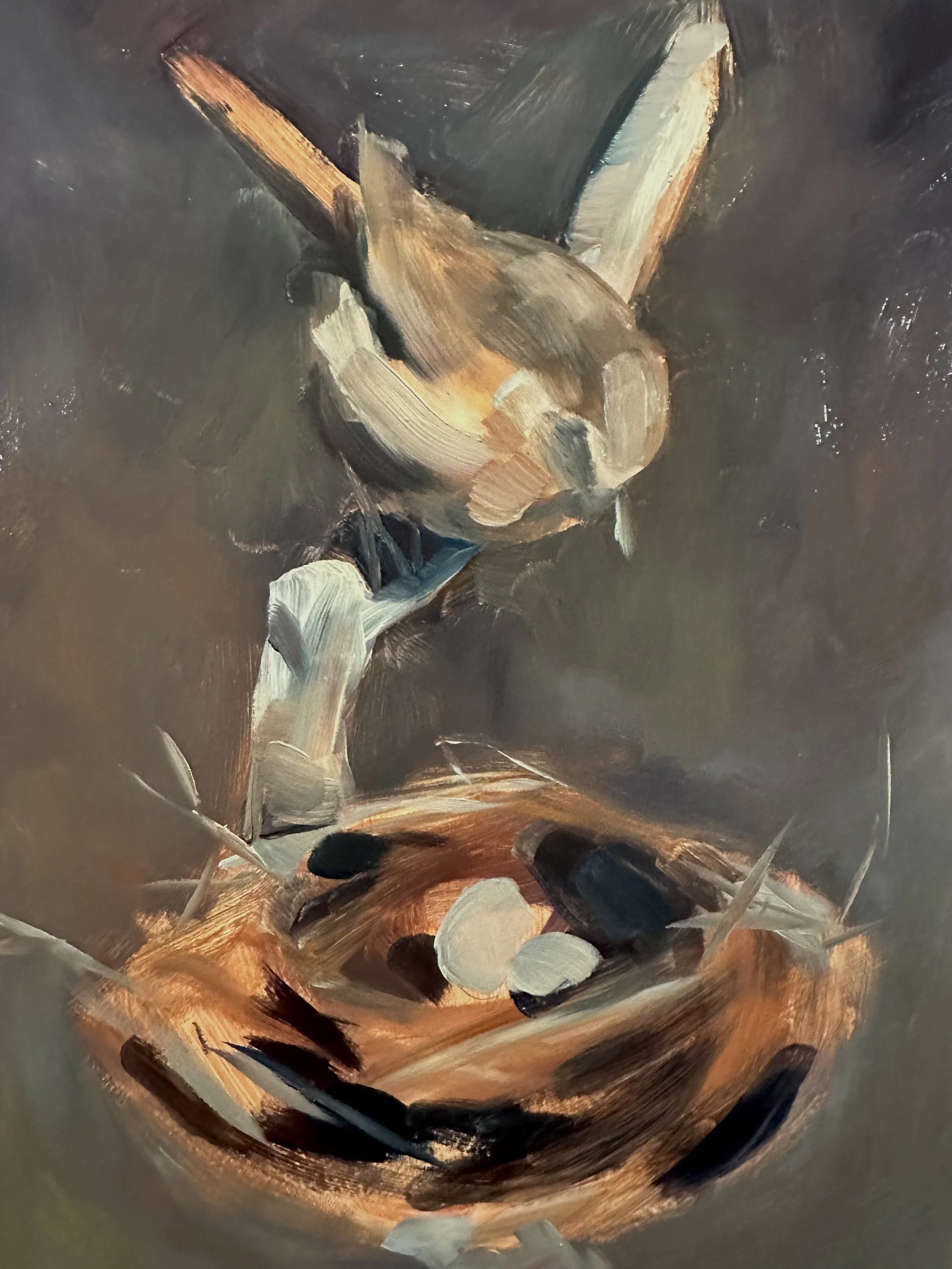 Progress photos of a commission for a Carolina Wren watching over her nest